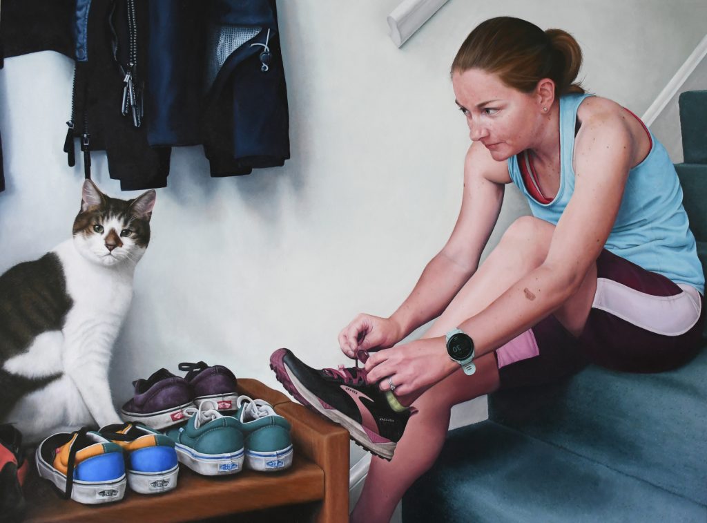 Another painting shows her lacing up her running shoes while her cat looks on.